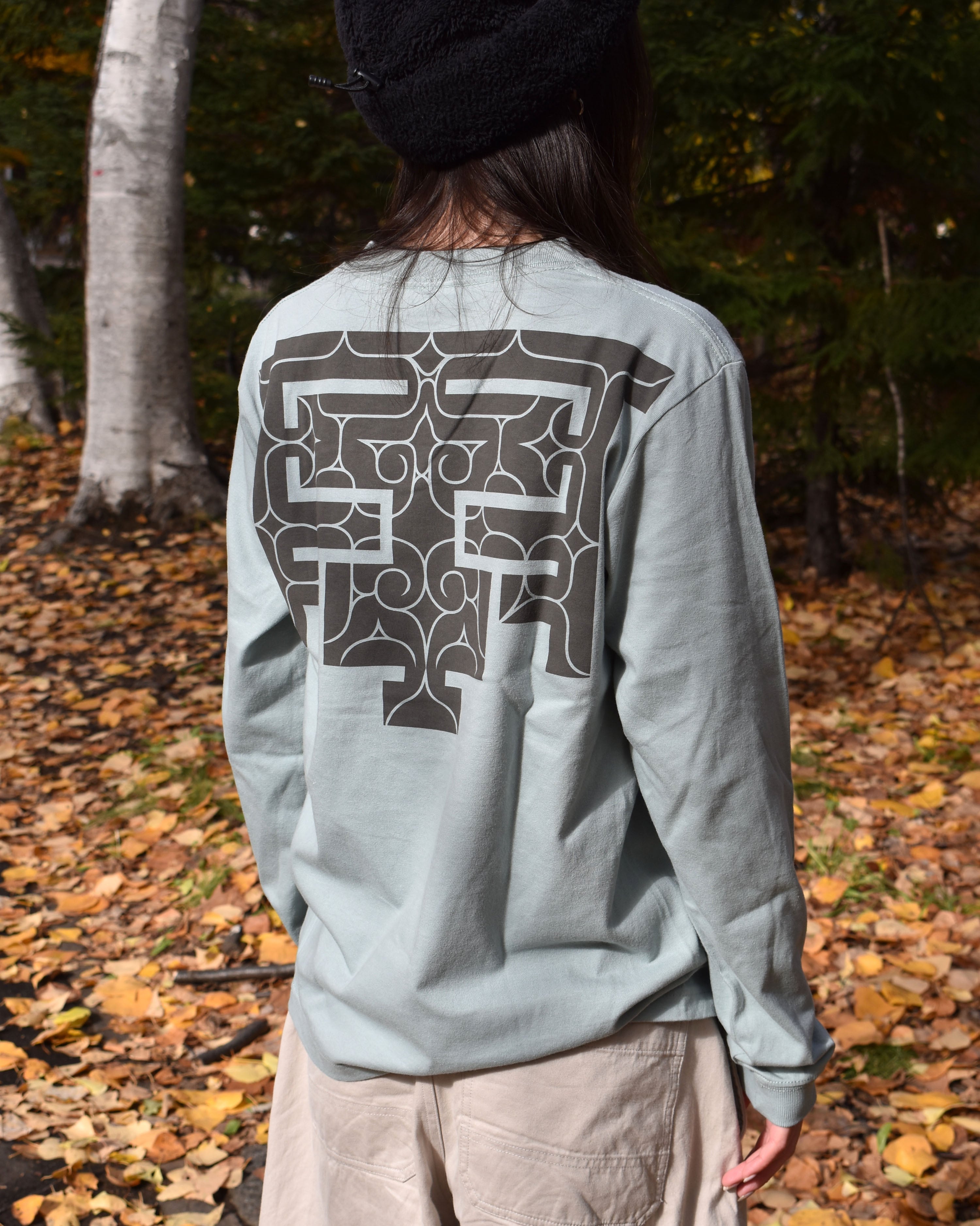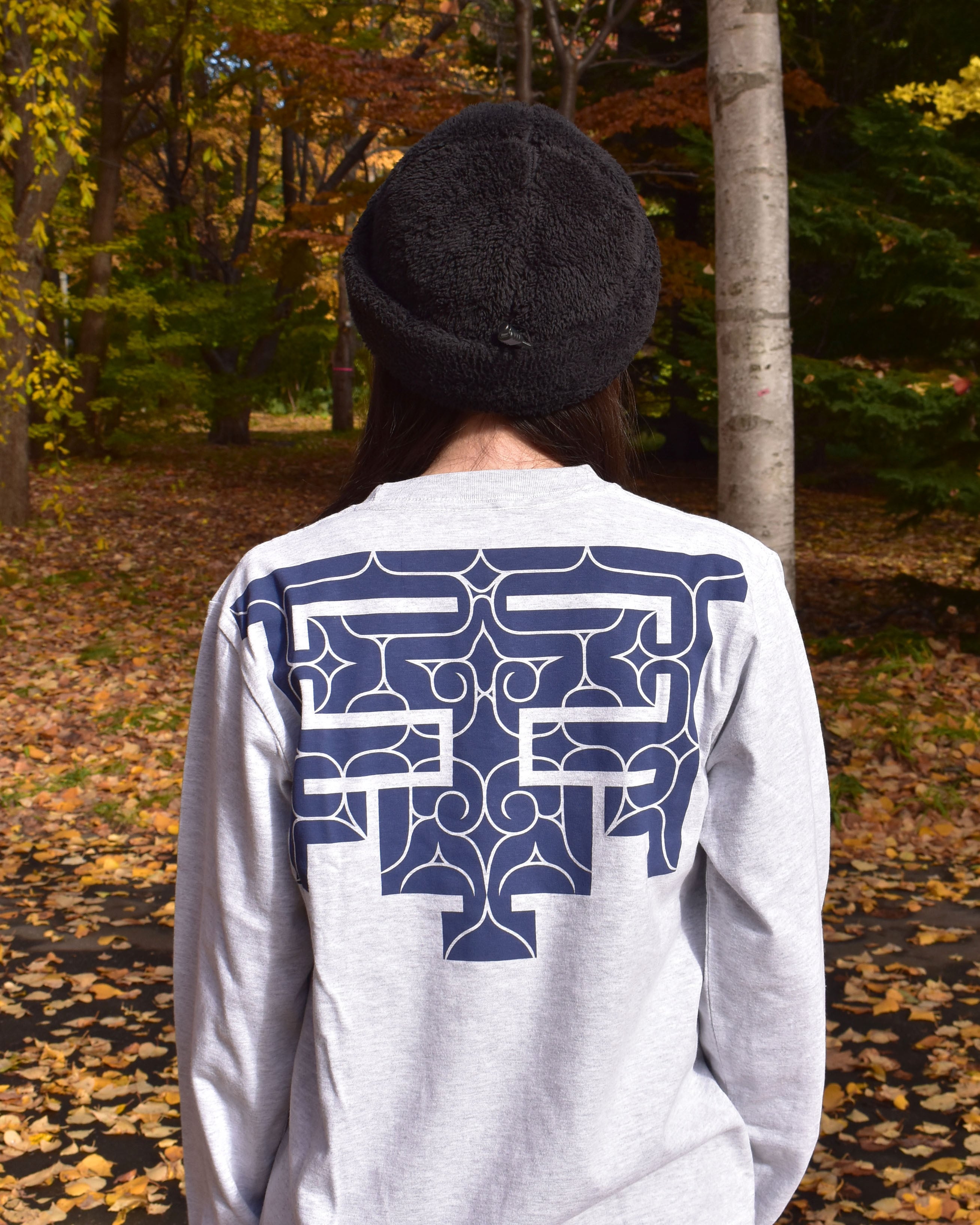 アイヌの伝統衣装「チカラカラペ」の文様をモチーフにしたTシャツ。主に袖口や襟、裾などにアイヌ文様が刺繍されたアイヌの伝統的な衣装をヒントに、背中に大胆にアイヌ文様をプリントしました。