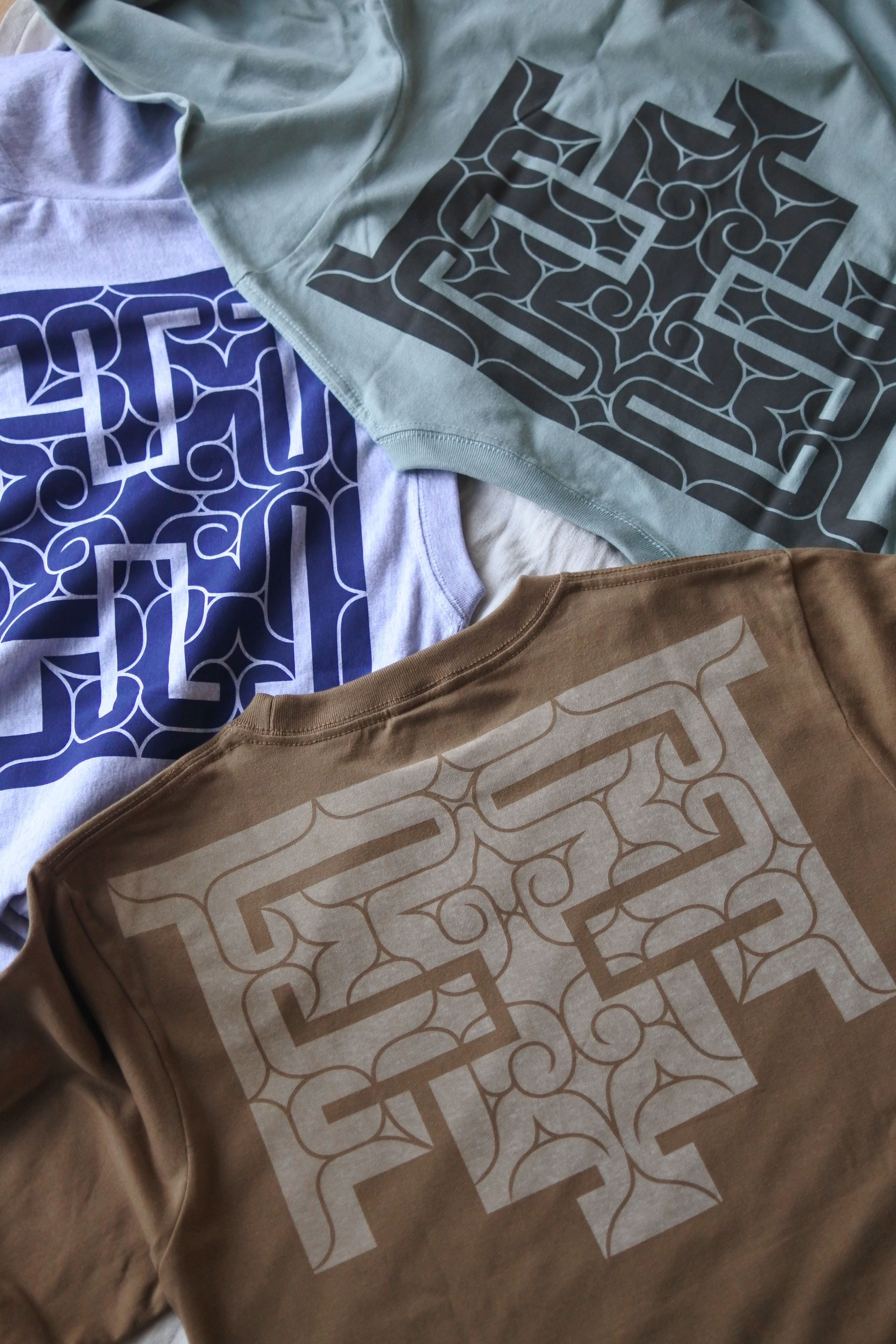 ボディカラー×プリントカラーは『アッシュ×ネイビー』『スモーキーグリーン×グレー』『ダークキャメル×アイボリー』の3色展開です。爽やかなアースカラーで男女共に着ていただきやすい色合いです。