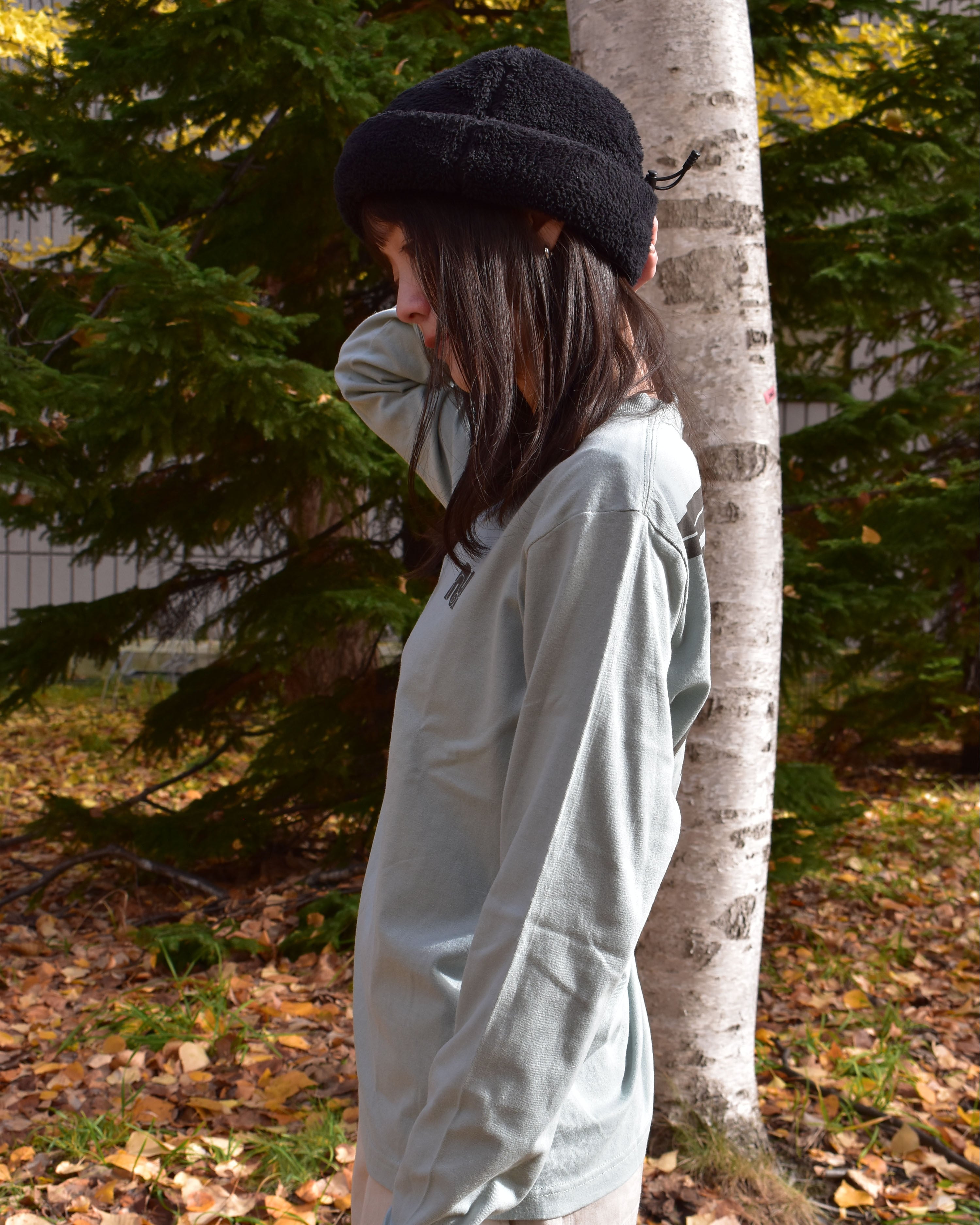 文様に力があるので、あえて落ち着いたカラーリングにまとめ、アイヌ文様を全体的に洗練されたイメージに仕上げました。フロントの左胸には二風谷ワークスのロゴマークをワンポイントで入れています。袖はリブがついています。
