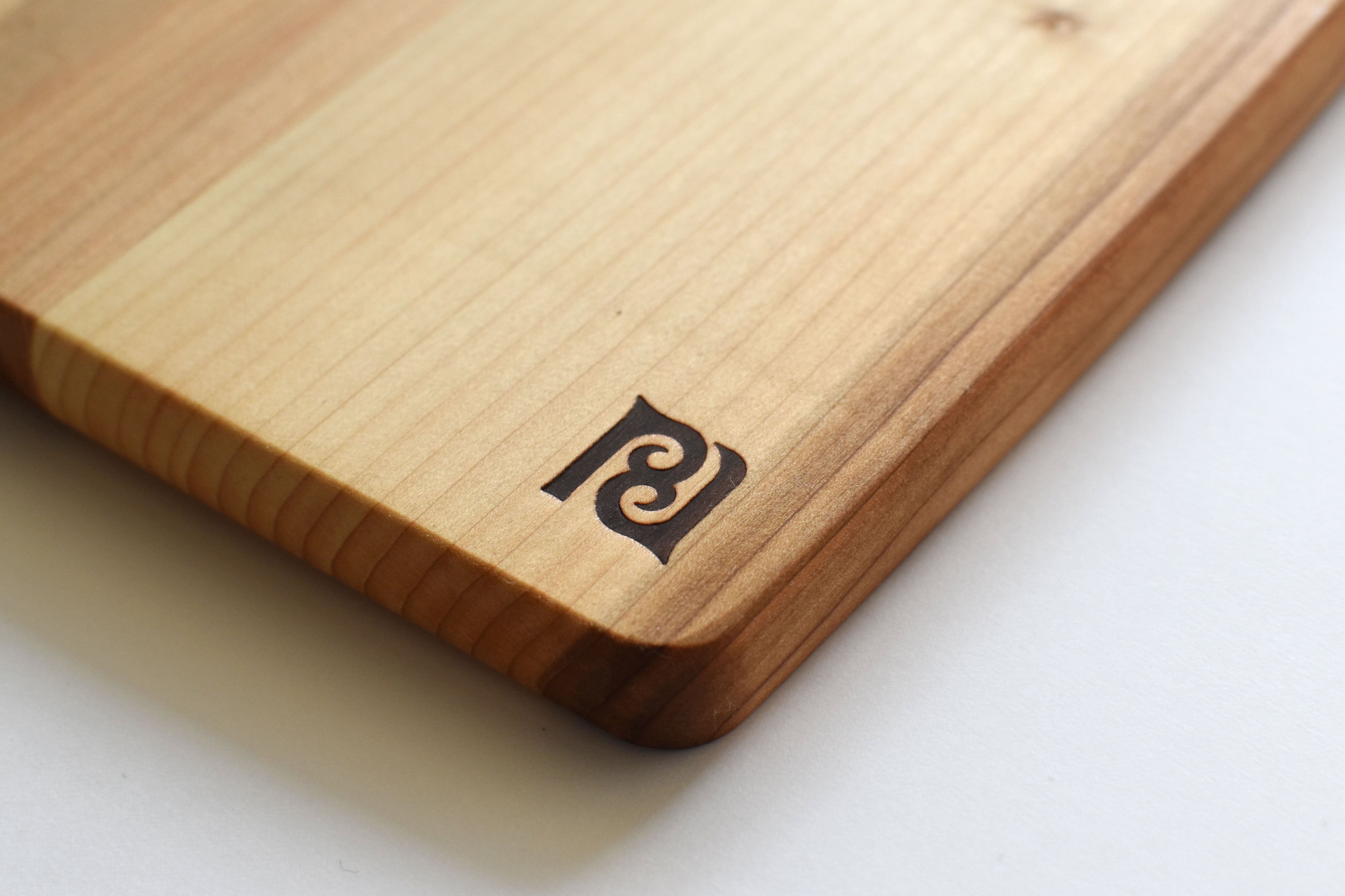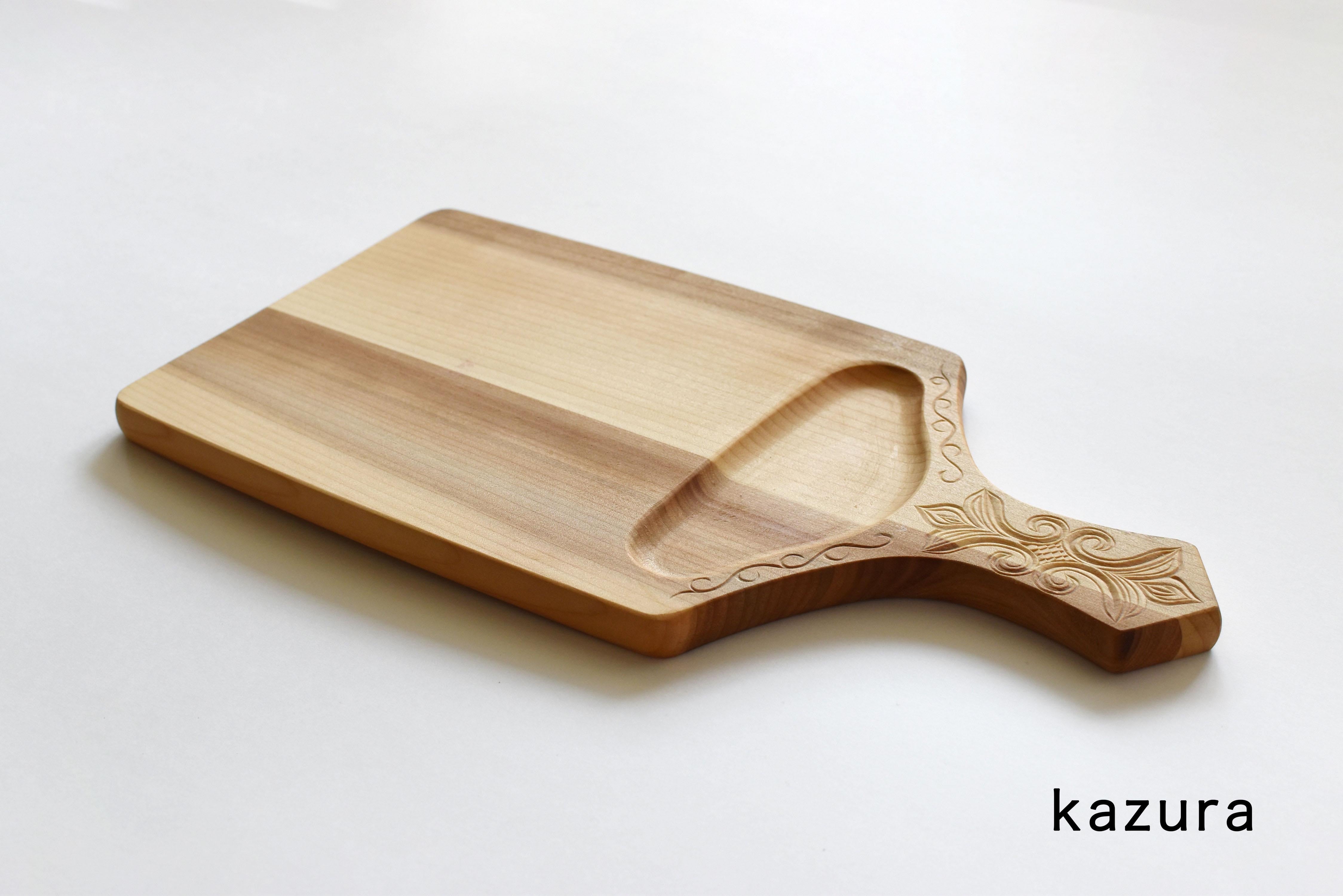 一つ一つ職人の手で丁寧に木彫りを施したカッティングプレート。アイヌ文様の彫刻が食卓に華を添え、未使用時はキッチンのインテリアとしての美しい佇まいにもこだわりました。アイヌの伝統的な道具である「メノコイタ」の要素を取り入れ、表面に凹みを作ることにより、まな板兼プレートとしての役割を果たします。