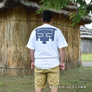 アイヌの伝統衣装「チカラカラペ」の文様をモチーフにしたTシャツ。