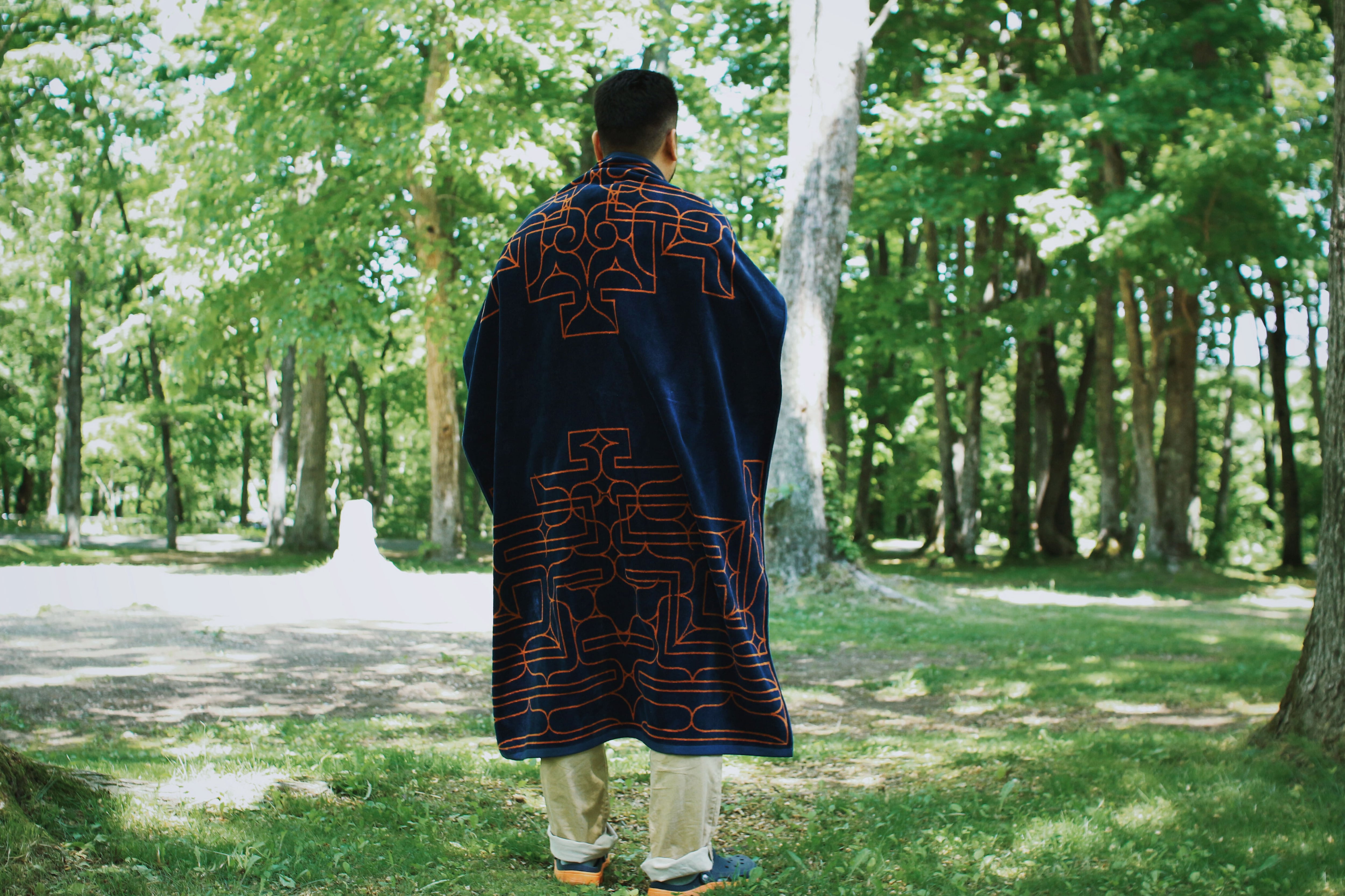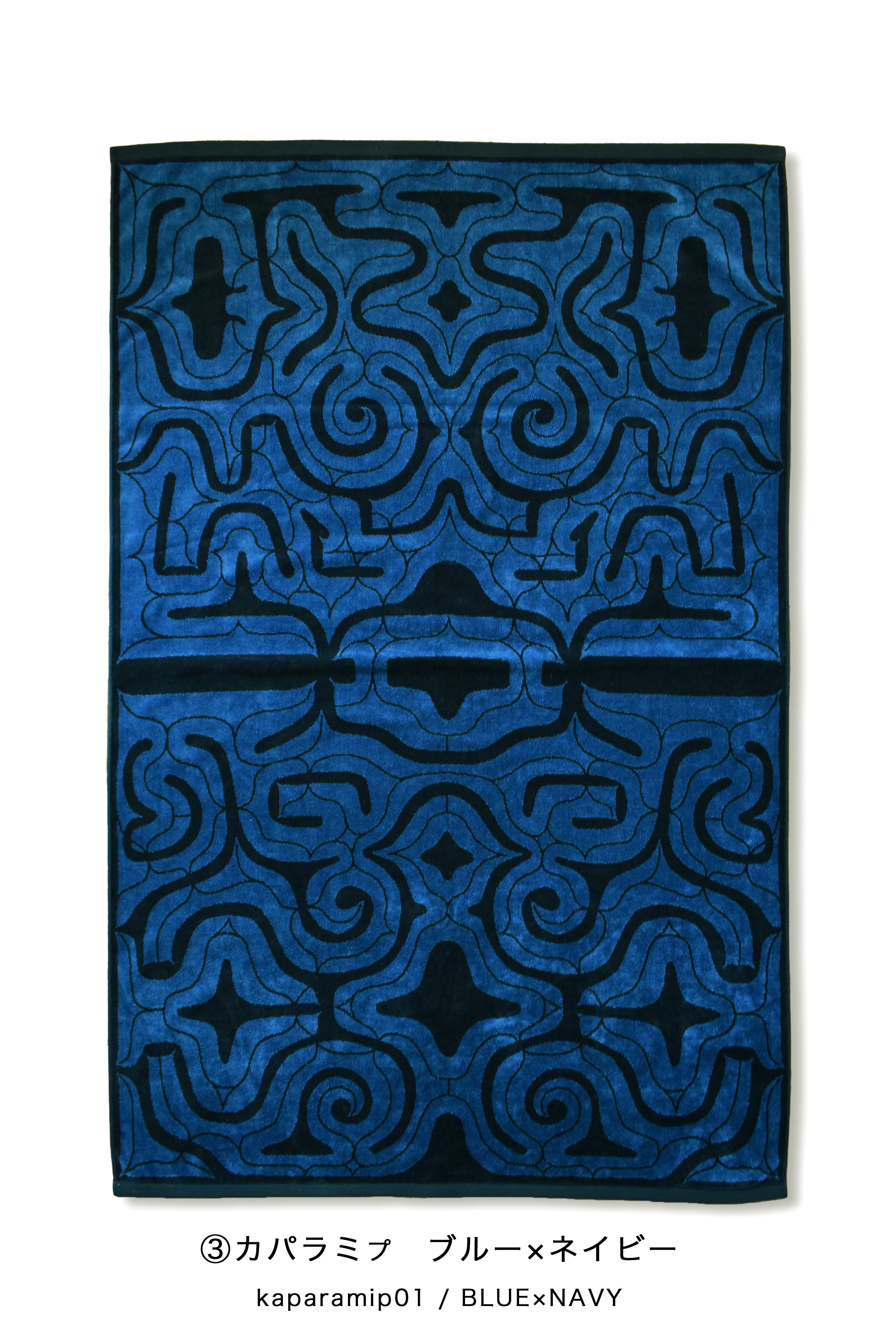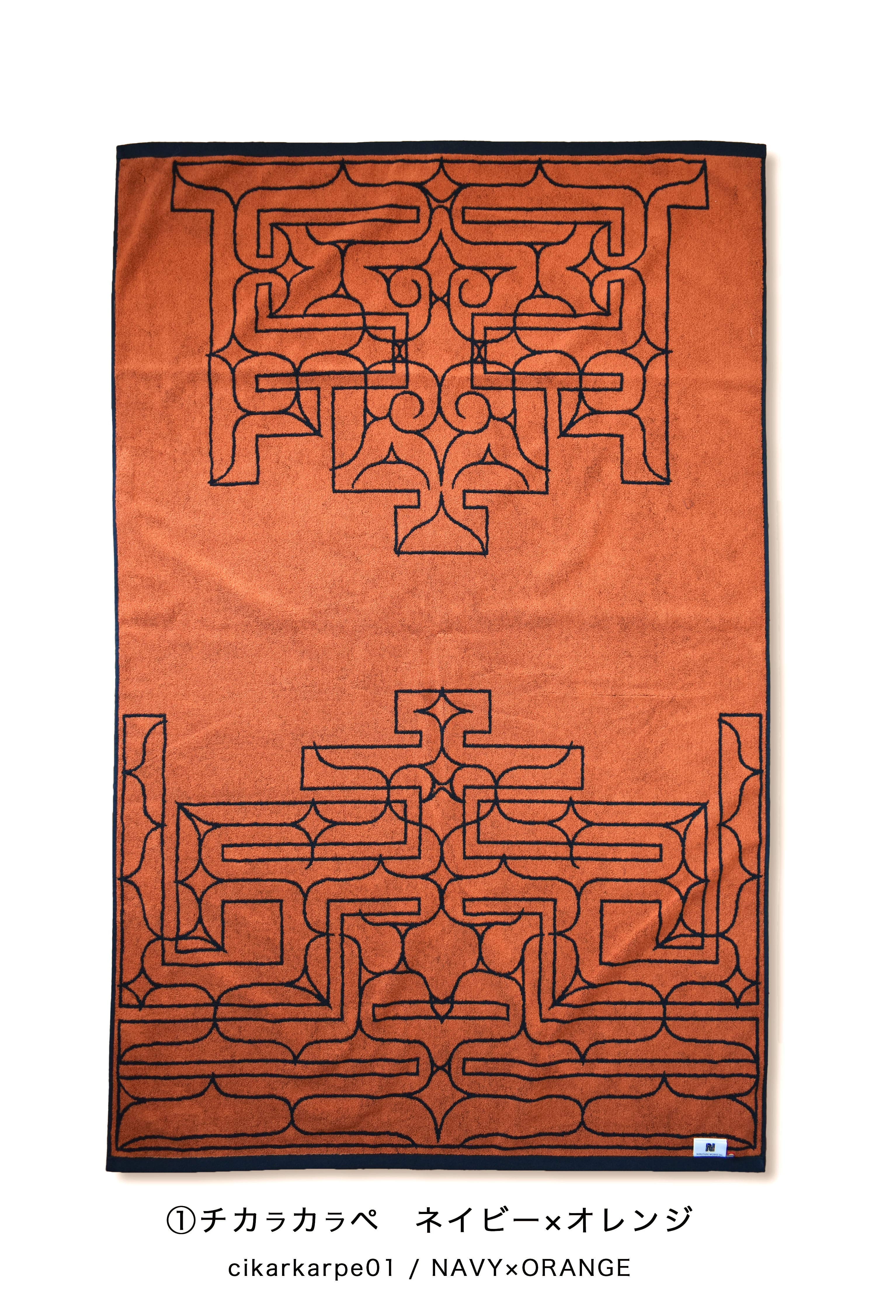 文様は代表萱野の祖母、萱野れい子さんが家族のために仕立てたアイヌの衣装「カパラミプ」と「チカラカラペ」の文様をアレンジ。アイヌ文様の繋がりや美しさを生かしながら、存在感のある配色で、お家でもアウトドアでも日常使いのしやすいデザインへと落とし込みました。